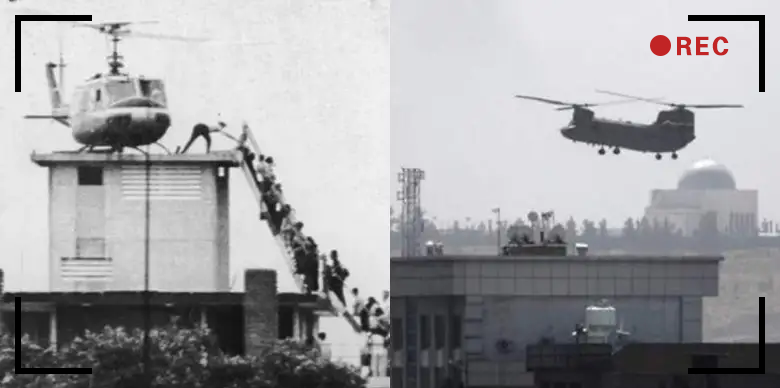 ▲左:美国1975年撤离越南西贡(胡志明市);右:美国2021年撤离阿富汗喀布尔