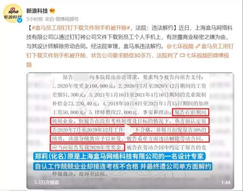 巧了,今天还有一件类似的事件被爆出。阿里旗下盒马员工用阿里旗下钉钉下载文件到个人手机,被以涉嫌泄露商业机密为由开除。
