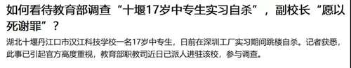 6月25日,刚过17岁生日不久的汉江科技学校的实习生小余在深圳的工厂被逼跳楼自杀。事件发生之后,学校做贼心虚,匆匆结束了“实习”。此事在网络发酵之后,教‘育’部派出了调查组,该校副校长还声称“事情查明,愿以死谢罪”。
