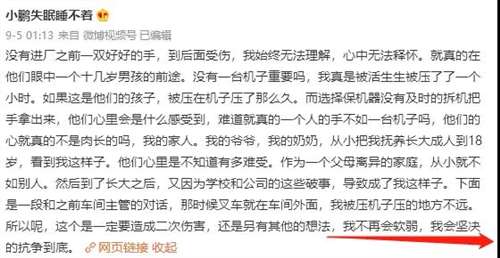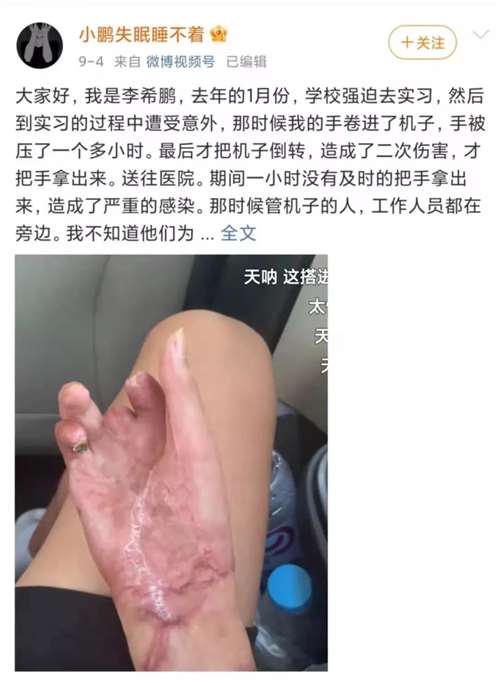 今年一月份被学校强制安排到工厂实习,手掌被卷入机器。资本家爱惜机器不肯拆下滚子救人,他的手掌被压了一个小时才开动机器把手倒出来,结果手掌感染,一个帅气的男孩变成了残废。