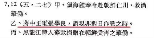 “蒋中正电张学良,谓现非对日作战之时”,《中华民国史事日志》1931年7月12日如此记录。