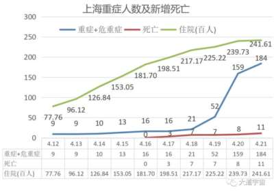 2022年4月17、18、19、20、21日,上海新增死亡3例、7例、7例、8例、11例,5天死亡36人,且还在增加;现有重型160例,危重型24例。