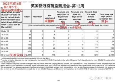 第三,我们看下图,英国政府2022年第13周新冠疫苗监测报告第44页:2022年3月6日至3月27日,英国确诊60天内死亡的80岁及以上老人有2614人,其中打了三针疫苗的死亡2106人,占80.6%;打了两针疫苗的死亡320人,占15.2%;未接种疫苗的死亡145人,只占5.5%。