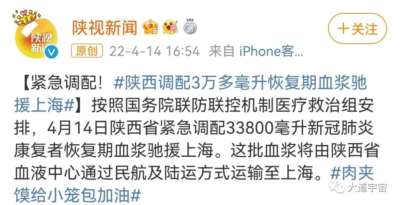 4月14日,在国务院救治组安排下,陕西紧急调配了33800毫升新冠康复者恢复期血浆驰援上海。