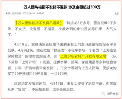 不知道这跟上海的保供乱象有没有关联。反正有一家叫上海沪昭农特产开发有限公司的企业,曾经发起了万人团购,结果群众钱交了之后,不发货、没客服、不退款。