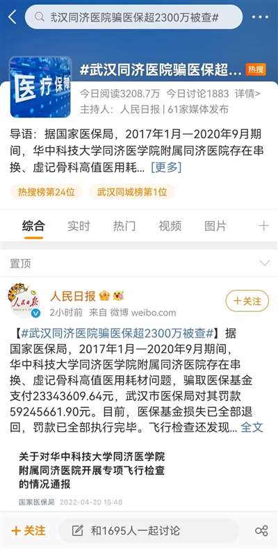 据国家医保局通报,武汉同济医院以不实耗材骗取医保基金超2300万,被罚了5900万。