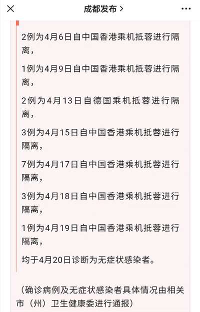 昨天(4月21日),成都发布公布的4月20日新增境外输入无症状感染者中,香港占了主要部分,而更加令人感到担忧的是,有两例是4月6日从香港飞到成都的: