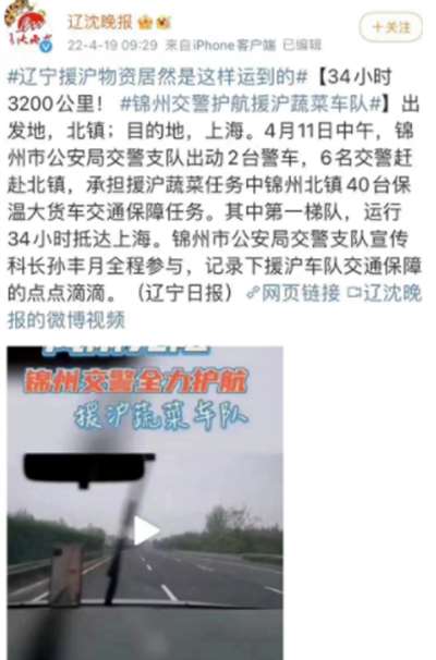 看到这样的说辞,作为捐赠方的辽宁当然无法淡定了,“辟谣”的第二天,辽宁媒体就发布了援沪物资运输的全过程:34小时3200公里,交警全程护航,以最短的时间、最稳妥的方式将物资送到了上海……