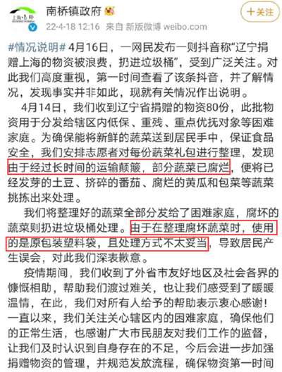 4月18日,上海南桥镇政府又出来“辟谣”,称“由于经过长时间的运输颠簸,部分蔬菜已腐烂”,所以垃圾袋里都是腐烂的蔬菜,只是“处理方式不太妥当”,使用了“原包装塑料袋”丢弃。