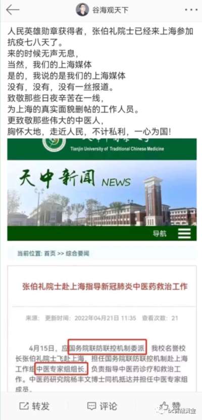 昨天,看到天津中医药大学官网的新闻,张伯礼院士已经飞赴上海,担任国务院联防联控机制赴上海工作组中医专家组组长。张院士已经紧张工作了一周,但是上海方面的媒体却是默不作声。如果不是天津中医药大学官网发出这个新闻,大家可能还不知道这个事情吧。