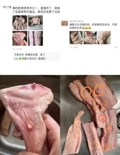 与此同时,很多网友又爆料,云南捐赠物资里的铁皮石斛和茶叶没有了。清单里是有的,但是实物却没有了;还有新疆的物资受潮了;还有广东捐赠的肉在十五天后终于被收到了。在十五天后,在网友的追问下,终于收到了。