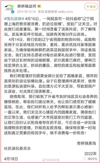 上海市南桥镇政府辟谣,说是被扔掉的蔬菜是发芽的土豆、挤碎的番茄、腐烂的黄瓜和包菜。说是这些蔬菜因为包装不当而腐坏。