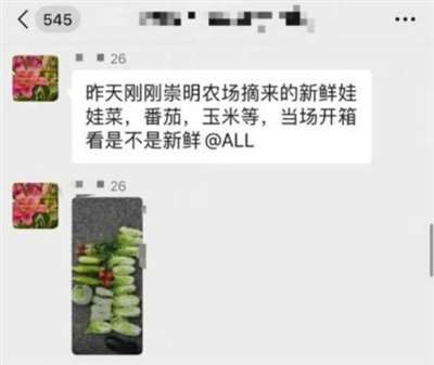 前两天,上海新静安区某小区群里,有人喊大家团购“崇明农场摘来的新鲜蔬菜”,90元一箱,不少人下了单。