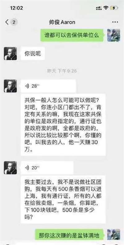 某上海志愿者洋洋得意地在微信上跟人炫耀,说自己进入上海做志愿者后,弄到了保供资格和通行证,现在卖香烟,1天赚1万。