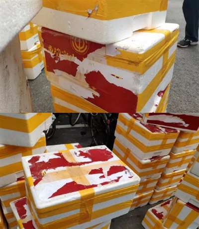 菜都是用泡沫箱包装好的,但泡沫箱上却粘着一些被撕却又没被完全撕掉的红色残纸。