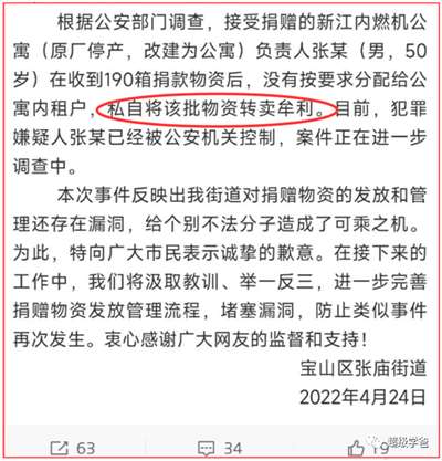 看这公告的意思,这锅由张某一人背了。我这里要提几个问题:第一,物资流向(分配)有没有公示;第二,领取有没有签字登记或拍照存证?第三,以后某些人的作案手段会不会更加隐蔽?
