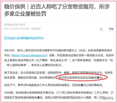 该小区居民们还发现,该批物资中,腊肠、医用口罩等其他相关企业,也存在缺乏资质、屡被处罚等问题,经志愿者统计,有近百位居民称吃完后出现腹泻情况。