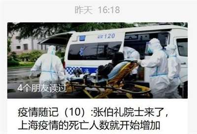 然后,有本地的自媒体就拿着这个数据开始带节奏了,说什么“张伯礼院士来了,死亡人数就开始增加了”。