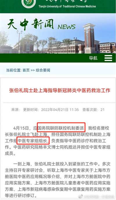 6天后上午,有细心的网友通过蛛丝马迹判断出张伯礼院士已经入沪支援(见《张伯礼低调入沪?希望上海媒体明示》);也正是这一天中午,天津中医药大学发文确认了这一信息,并明确了张伯礼院士的身份——“赴XX工作组中医专家组组长”。