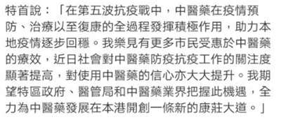 看看:“广东派出的中医专家队伍,在香港掀起中医药热潮”;“根据临床专家的反馈,香港患者对中医药的接受程度较高”。