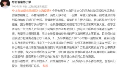 他的父亲52岁,没有任何基础疾病,却在上海罗泾富长路方舱医院离奇身亡,加上此前在隔离点的时间,一共隔离了25天,而且马上就要出院了。其父死亡后,医院没有及时通知家属,还和他说需要尽快处理尸体,按相关规定可以不经过家属同意火化。