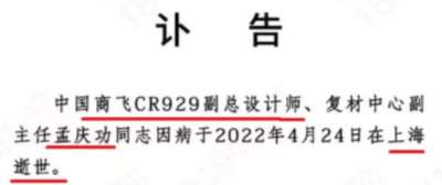 商飞的副总师孟庆功于4月24日因病去世,而社区相关通告显示,他因为志愿者工作劳累过度突发疾病去世。
