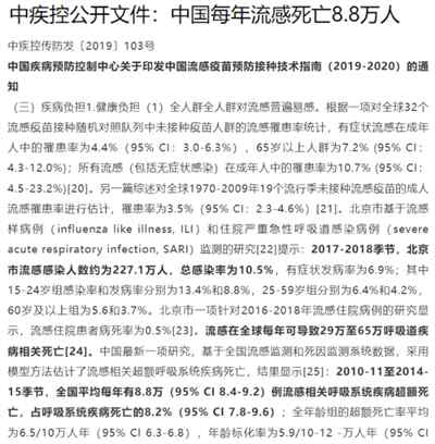 为了推广(销)流感疫苗,专家们“基于全国流感监测和死因监测系统数据,采用模型方法估计了流感相关超额呼吸系统疾病死亡,结果显示:2010-11至2014-15季节,全国平均每年有8.8万例流感相关呼吸系统疾病超额死亡,占呼吸系统疾病死亡的8.2%……全年龄组的超额死亡率平均为6.5/10万人年。”