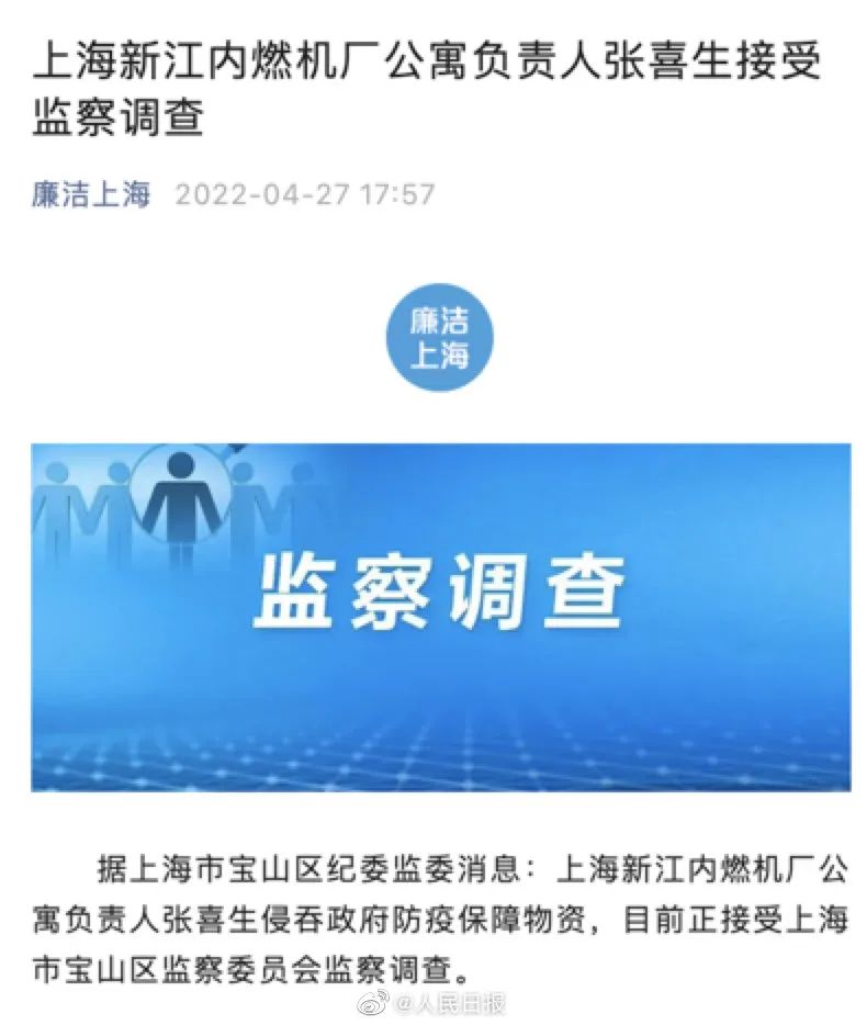 第二条,是倒卖云南曲靖捐赠物资的案子,有了结果:上海新江内燃机厂公寓负责人张喜生侵吞政府防疫保障物资,目前正接受上海市宝山区监察委员会监察调查。
