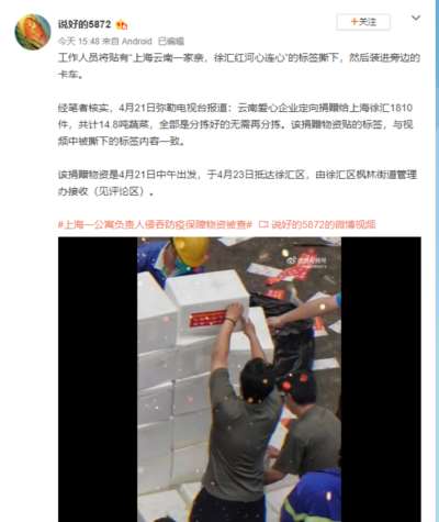 经笔者核实,4月21日弥勒电视台报道:云南爱心企业定向捐赠给上海徐汇1810件,共计14.8吨蔬菜,全部是分拣好的无需再分拣。该捐赠物资贴的标签,与视频中被撕下的标签内容一致。