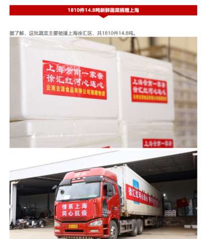 报道中说,4月21日,弥勒市爱心企业——云南吉源食品有限公司,慷慨解囊,向上海市徐汇区捐赠新鲜蔬菜1810件14.8吨,紧急驰援。