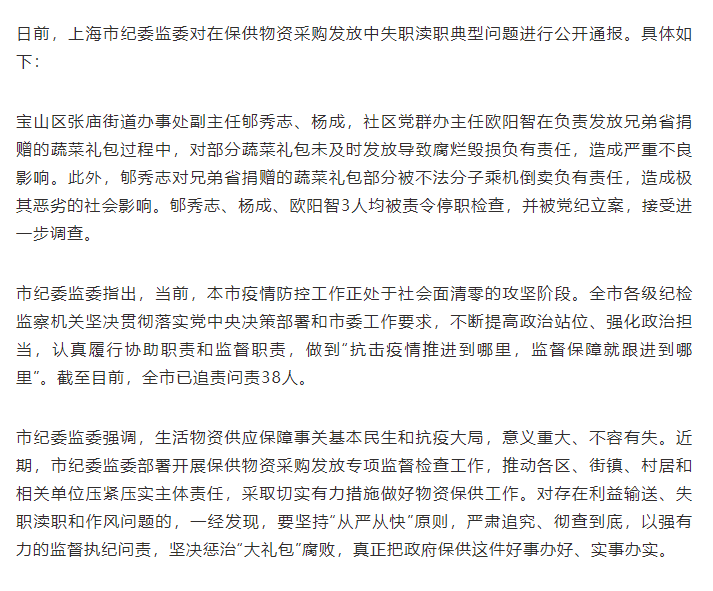 第一条,是上海市纪委监委对在保供物资采购发放中失职渎职典型问题进行公开通报,指“宝山区张庙街道办事处副主任郇秀志、杨成,社区党群办主任欧阳智在负责发放兄弟省捐赠的蔬菜礼包过程中,对部分蔬菜礼包未及时发放导致腐烂毁损负有责任,造成严重不良影响。此外,郇秀志对兄弟省捐赠的蔬菜礼包部分被不法分子乘机倒卖负有责任,造成极其恶劣的社会影响。郇秀志、杨成、欧阳智3人均被责令停职检查,并被党纪立案,接受进一步调查。”