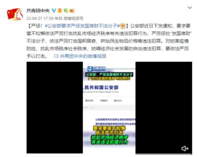 也就在昨天,有一条重磅消息传来,是说在近日,公安部下发通知,要求要毫不松懈依法严厉打击扰乱市场经济秩序有关违法犯罪行为,严厉惩处“发国难财”不法分子,依法严厉打击囤积居奇、哄抬民生物品价格等违法犯罪。对妨害疫情防控、扰乱市场秩序社会秩序、妨碍经济社会发展的突出违法犯罪,要依法严厉予以打击。