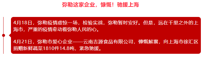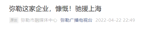 而在4月22日晚上,云南红河弥勒市广播电视台曾在微信公众号上发布文章《弥勒这家企业,慷慨!驰援上海》。