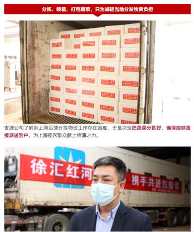 报道中指出:吉源公司知道上海后续分拣物资工作存在困难后,还提前把蔬菜分拣好,确保能够直接派送到户。