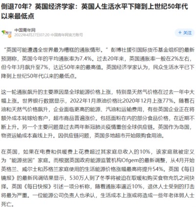 在早已对病毒躺平共存的英国,近日有经济学家出来讲,“英国人生活水平下降到上世纪50年代以来最低点”。