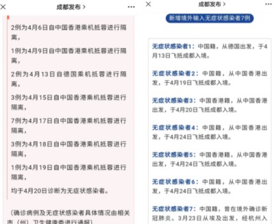 尝试缩短“封控期”笔者是完全支持的,但不知道缩短“入境隔离期”的科学依据何在?成都通报的4月22日和27日的境外输入病例中,都存在14天隔离期行将结束的最后一天才发现阳性的案例: