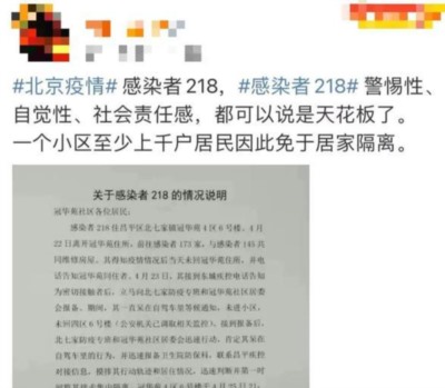 当然不可否认的是,的确存在另一种人:例如“外省”的某些人他们在本地已经“大爆发”的情况下,仍然跑到杭州、合肥、成都等各个城市,他们并不是为了谋生,而仅仅是为了旅游;他们一落地不是先住下自我隔离,而是立即去人最多的商场、夜市闲逛。这其实是极端自私自利的一些人,他们认为防疫妨碍了他们的个人自由,他们或许就是因为受到网红专家的误导,认为这个病毒就是个“大号流感”,甚至还不如“流感”。人们对北京“感染者218”疯狂的刷屏点赞,不就是对极端自私者的厌恶情绪的反向宣泄吗?