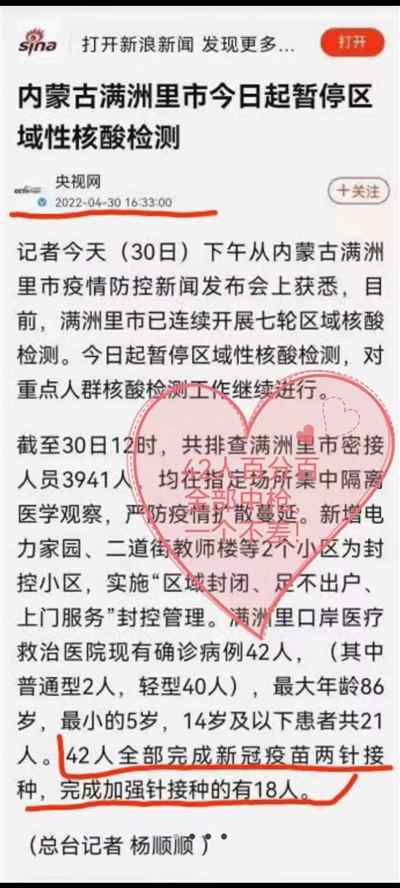 同样是通报疫情,2022年4月30日,内蒙满洲里口岸医疗救治医院现有确诊病例42人,以普通型和轻型患者为主。42人全部完成新冠疫苗两针接种,完成加强针接种的有18人。