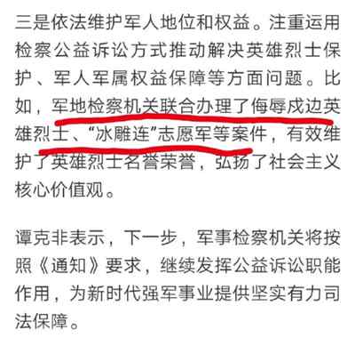 据我国防部发言人的披露,“军地检察机关联合办理了侮辱戍边英雄烈士、“冰雕连”志愿军等案件,有效维护了英雄烈士名誉荣誉,弘扬了社会主义核心价值观。”