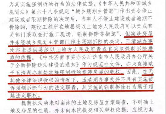 2020年4月,法院在判决书中认为,玉清湖街道办事处根本没有实施强制拆除案涉房屋的职权,街道办实施强拆,超越了法定职权,属于违法强拆。