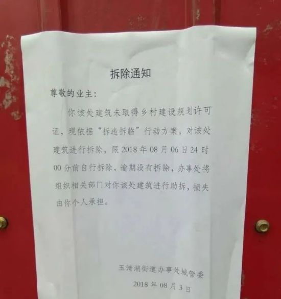 2018年8月3日,玉清湖街道办事处在薛峰厂房大门上张贴了拆除通知,限其在2018年8月6日24时前自行拆除,逾期不拆将组织助拆。