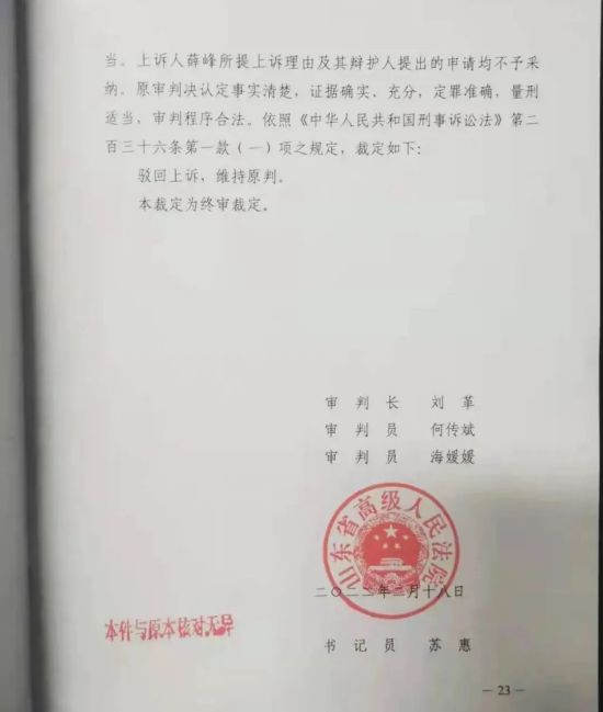 2022年2月18日,山东高院作出了二审裁定,驳回了薛峰的上诉,维持了此前无期徒刑的判决。