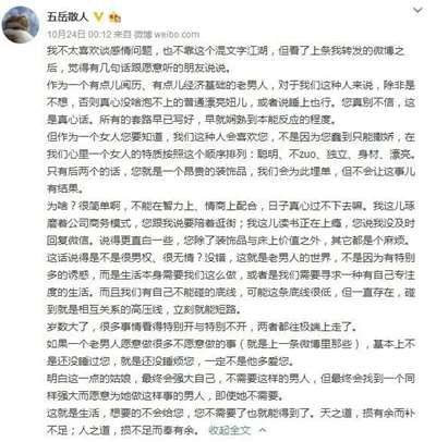 五岳散人曾经发微博说:“作为一个有点经济基础的老男人,对于我们这种人来说,除非是不想,否则真心没啥泡不上的普通漂亮妞儿,或者说睡上也行,您真别不信,这是真心话。”我只能说五岳散人真是一个丑信男,那么丑,还那么自信……