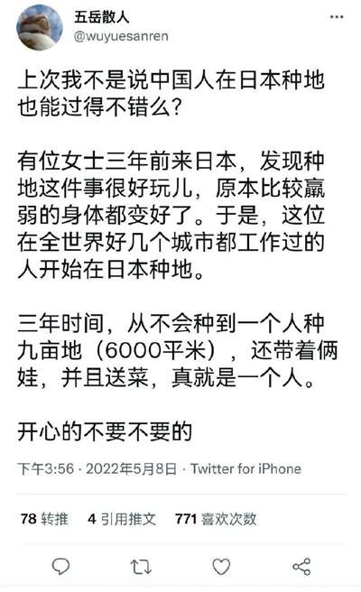 去日本的公知五岳散人发推说:“有位女士三年前来日本,发现种地这件事很好玩儿,原本比较羸弱的身体都变好了……从不会种到一个人种九亩地,还带着俩娃,并且送菜,真就是一个人。开心的不要不要的”