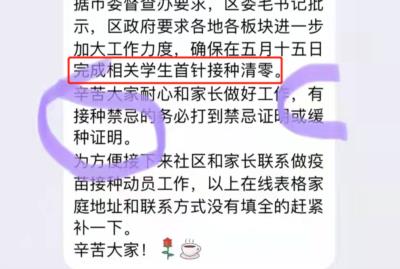 如,有某市某区提出:区政府要求各板块进一步加大工作力度,确保在五月十五日完成相关学生首针接种清零。辛苦大家耐心和家长做好工作,有接种禁忌的无比打到禁忌证明或缓种证明……