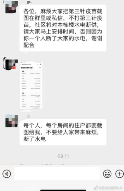 4月底的时候,笔者还看到有微博博主晒出图片,深圳某社区通知:不打第三针YM,社区将对本栋楼水电断供。并要求:请大家马上安排时间,不要因为你一个人(不打)断了大家的水电。