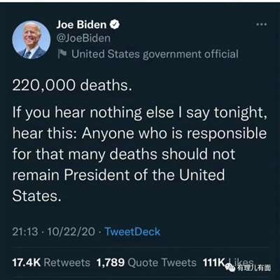 2020年10月,美国新冠死亡人数突破22万时,当时还没上任的拜登曾说过“任何对那么多人死亡负有责任的人,都应该辞职!”