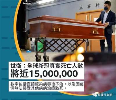 世界卫生组织5月5日发表报告,推算全球新冠真实死亡人数将近1500万,是官方呈报数字的将近三倍。世卫认为,许多国家低估了死于新冠肺炎的人数,大约有950万死亡病例没有被计入统计。