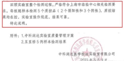 值得注意的是,出具13名假阳性报告的检测企业均指向了“上海中科润达医学检验实验室有限公司”,该企业随即出具“情况说明”,称“质控结果均在控,实验室操作规范,结果可靠”。
