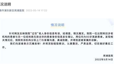 由于整件事情过于离谱,当时有不少网友对爆料的真实性提出质疑。可就在今天下午,上海周浦医院就此事做出回应称,经调查,情况属实。上海周浦医院表示,据了解,该院一位出院转回涉老机构的患者与另一位经抢救无效去世的患者身份信息发生错认,两位均为93岁高龄患者。